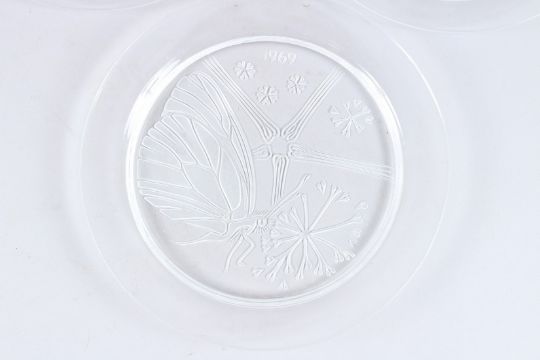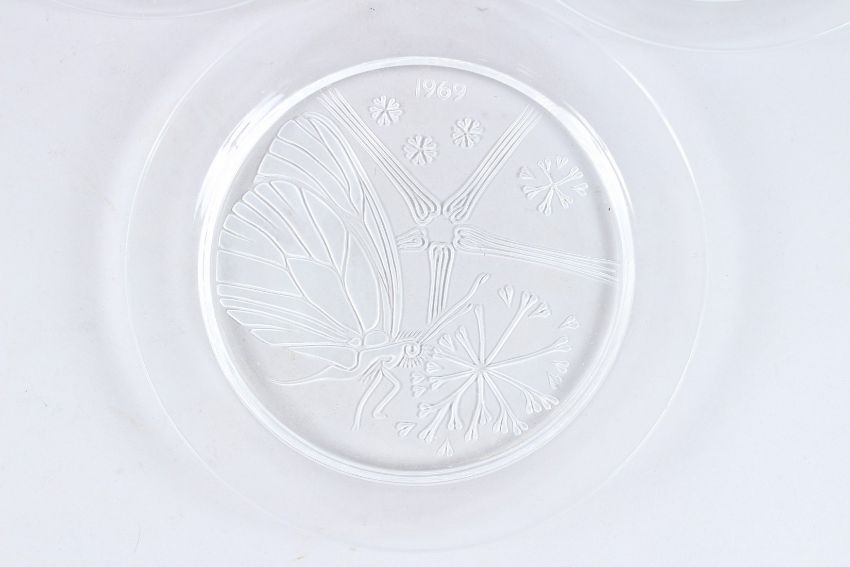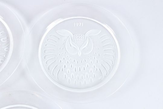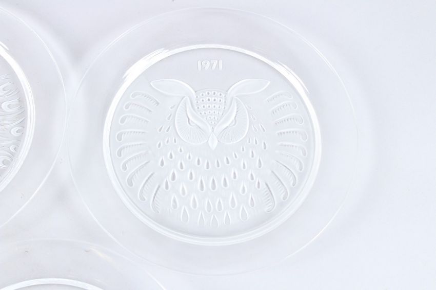 A SET OF THREE LALIQUE TYPE BIRD AND FISH PLATES, 1973, 1974 and 1975.