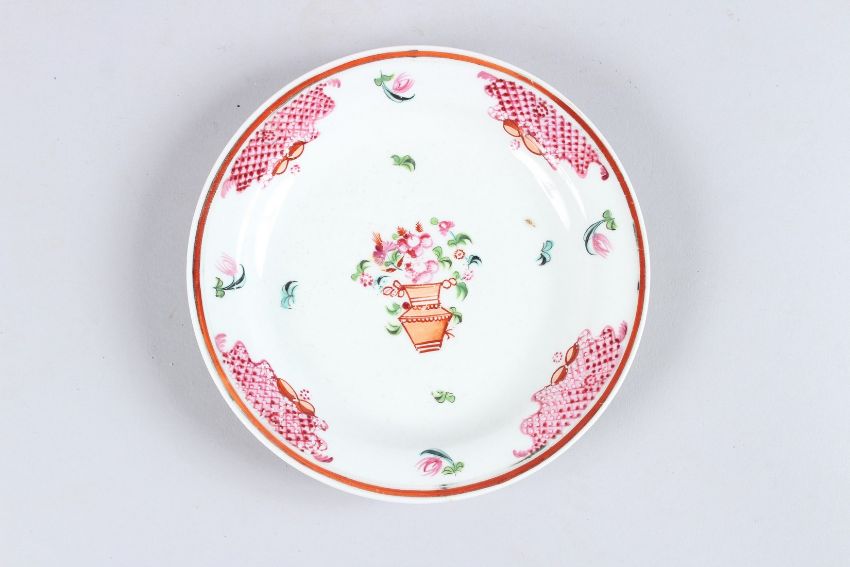 A NEW HALL CIRCULAR FAMILLE ROSE PLATE.