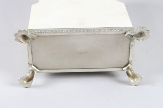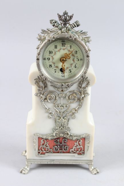 A VERY GOOD RUSSIAN SILVER AND HARDSTONE CLOCK inset with diamonds, on four claw feet.