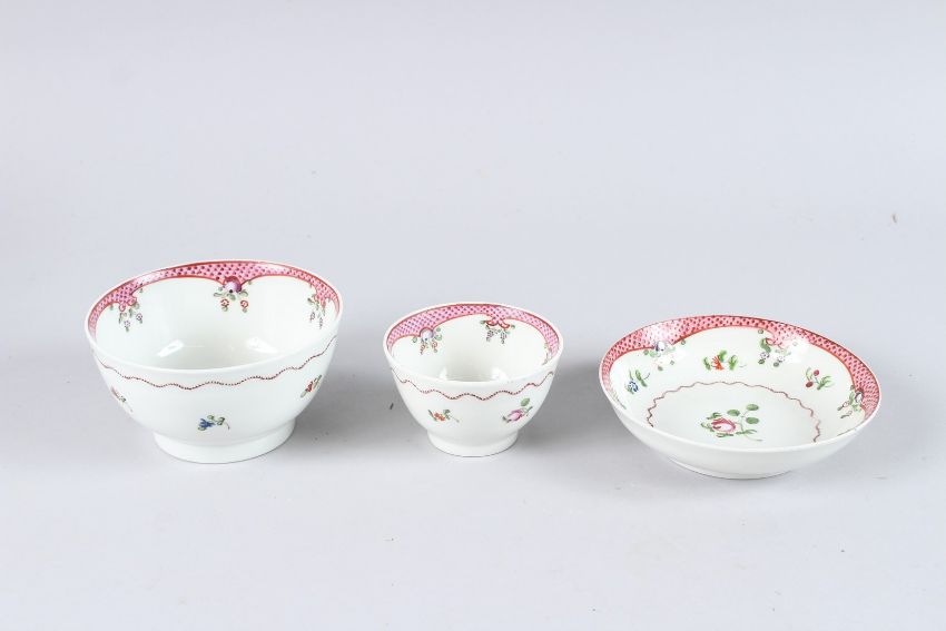 A NEW HALL FAMILLE ROSE BOWL, 4.5ins diameter, and a tea bowl and saucer, 3ins diameter.