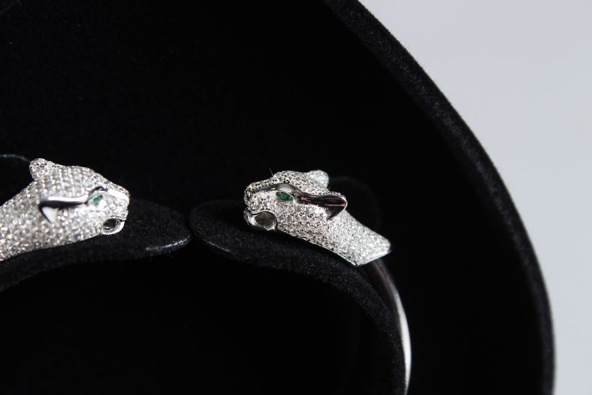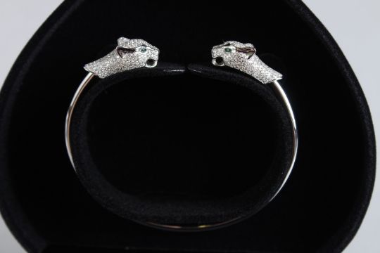A SILVER DOUBLE PANTHER HEAD BANGLE.