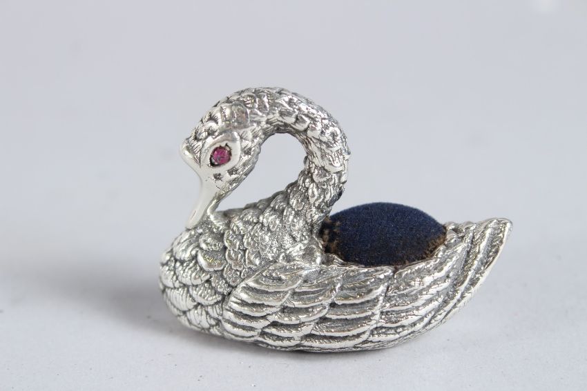 A SILVER RUBY EYE SWAN PIN CUSHION.