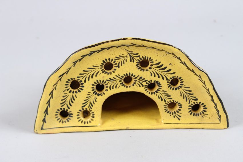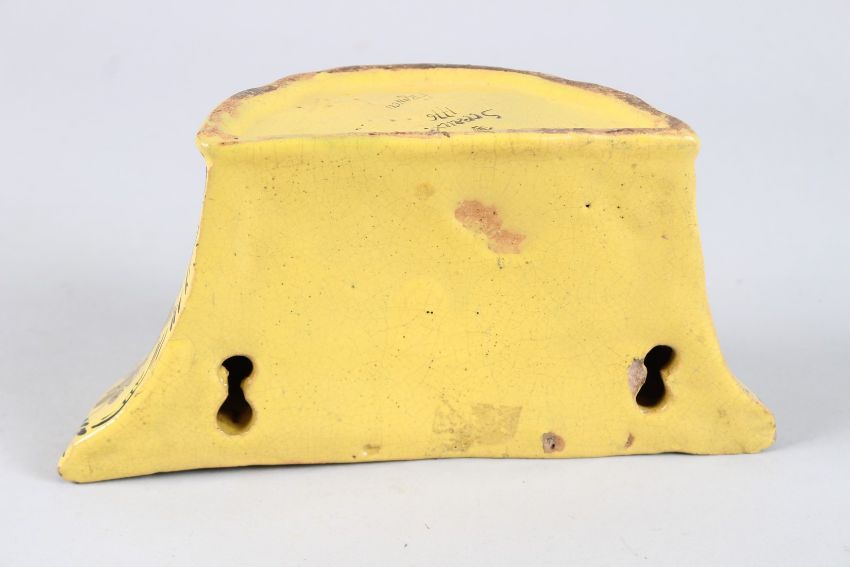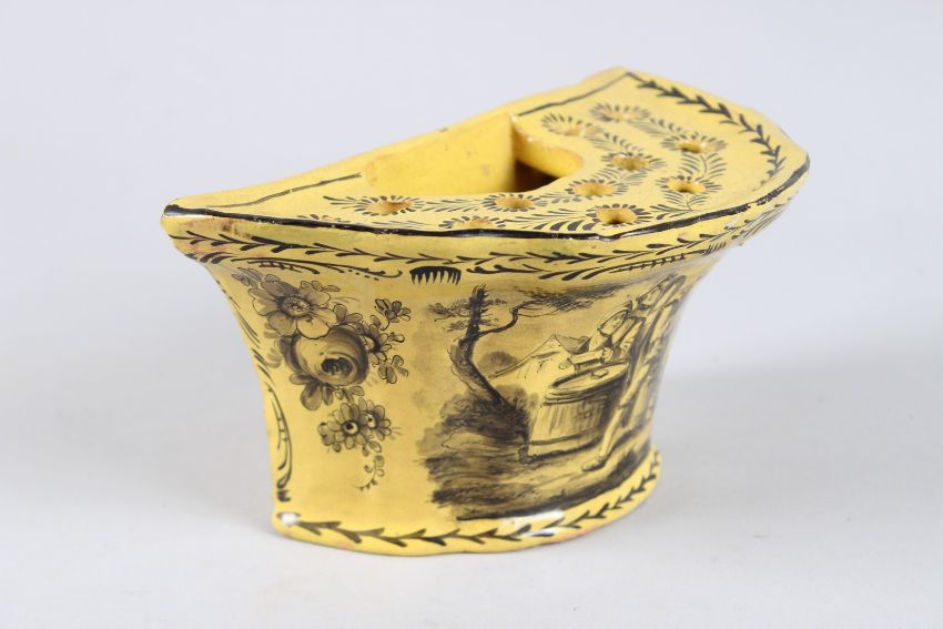 AN 18TH CENTURY FRENCH YELLOW GLAZED CROCUS POT painted with figures.