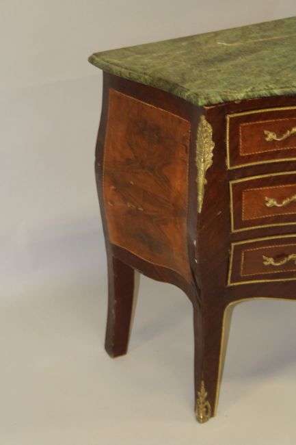 A SMALL LOUIS XVITH STYLE MARBLE TOP THREE DRAWER COMMODE on curving legs.