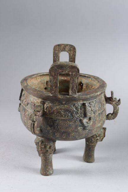 A CHINESE ARCHAIC THREE LEGGED CIRCULAR BRONZE KORO.
