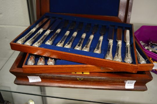 A CASED SET OF EIGHTEEN SILVER HANDLED DESSERT KNIVES AND FORKS.