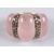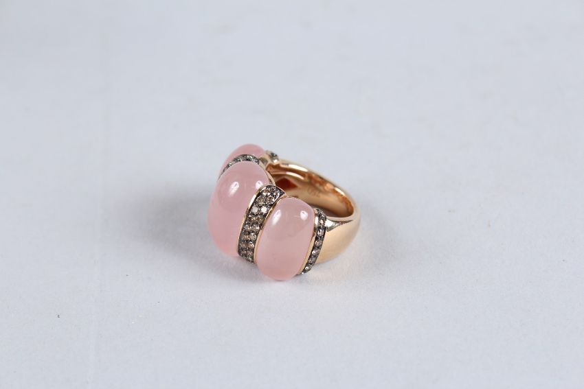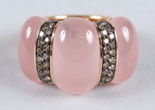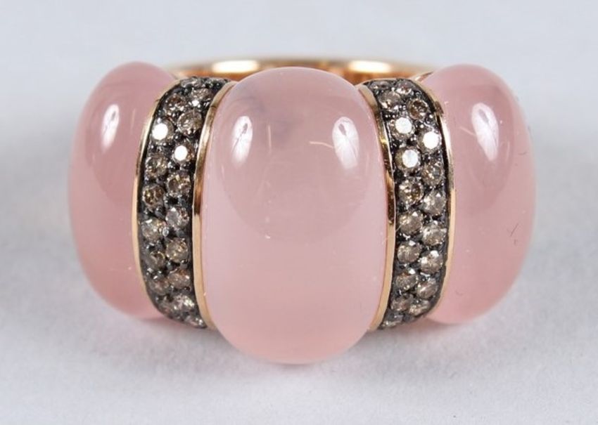 A GOOD 18CT GOLD THREE STONE PINK QUARTZ AND DIAMOND RING.