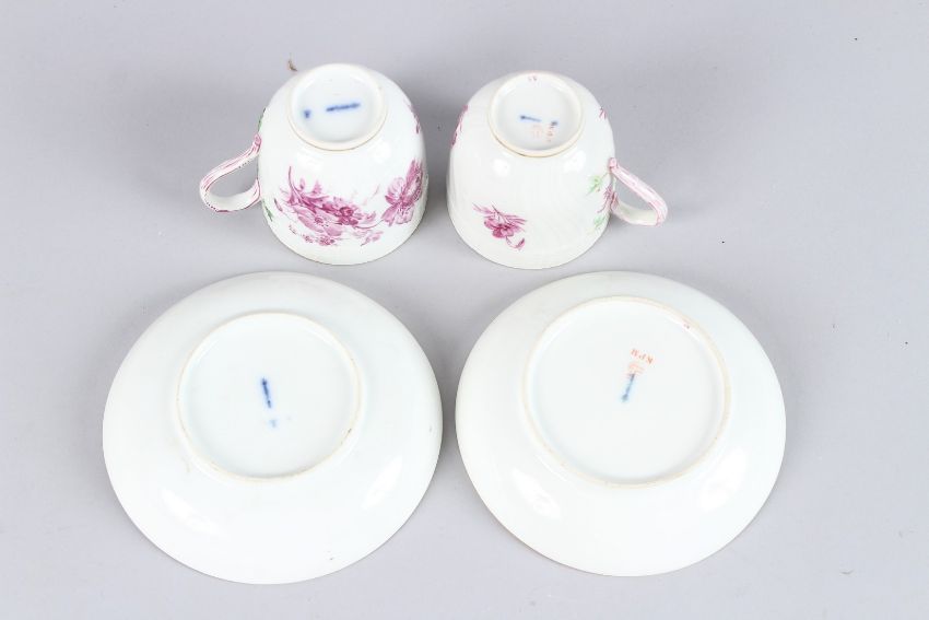 TWO BERLIN FAMILLE ROSE CUPS AND SAUCERS.