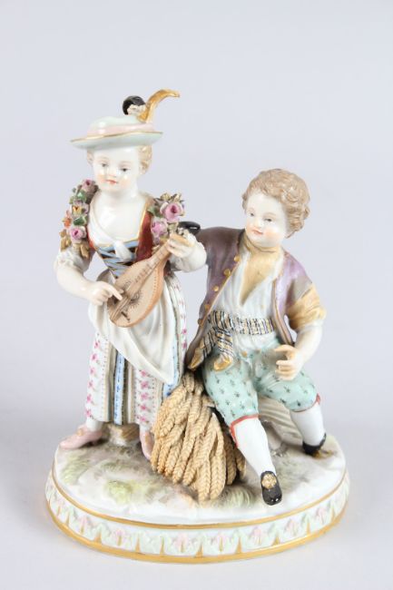 TWO 19TH CENTURY MEISSEN GROUPS OF CHILDREN, in a sleigh and a girl with mandolin.
