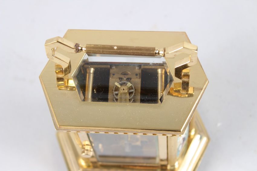 A GILT BRONZE OCTAGONAL CARRIAGE CLOCK with porcelain panels.