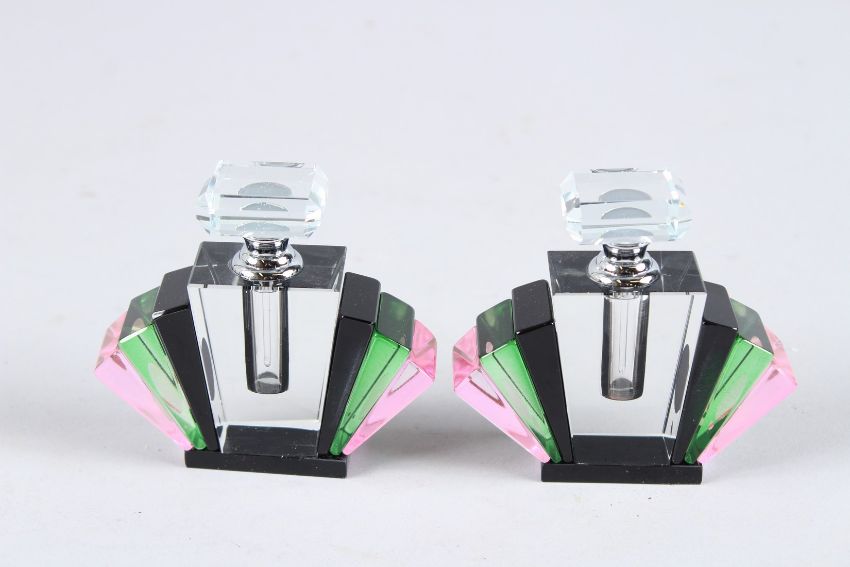 A SMALL PAIR OF ART DECO DESIGN BLACK, GREEN AND PINK FAN SHAPE SCENT BOTTLES.