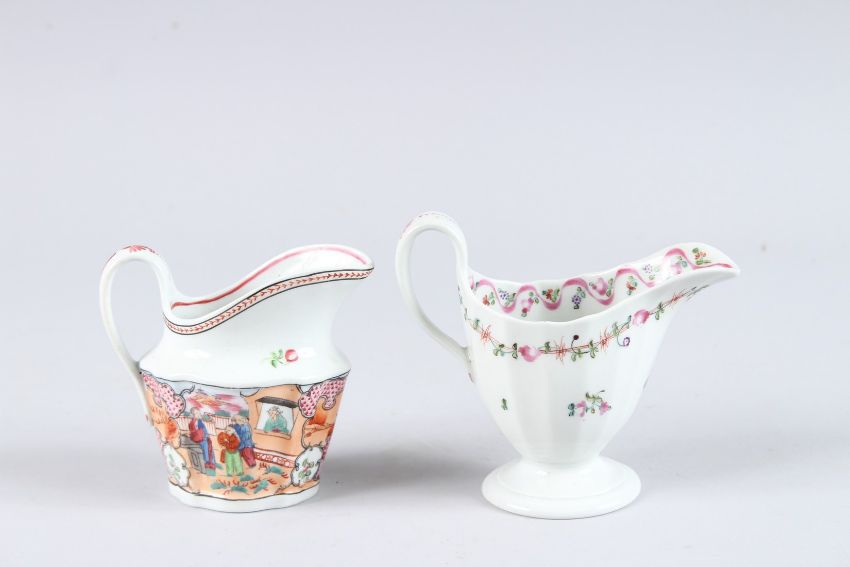 TWO NEW HALL CREAM JUGS, one with Chinese figures, the other with flowers.
