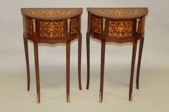 A PAIR OF LOUIS XVITH DESIGN INLAID HALF-MOON BEDSIDE TABLES with two drawers.
