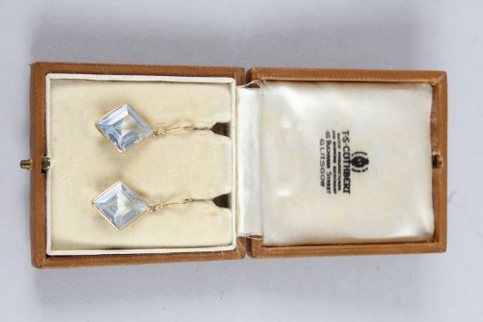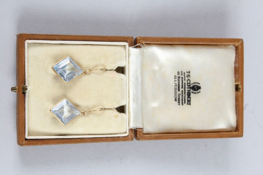 A PAIR OF 18CT GOLD AQUAMARINE DROP EARRINGS.