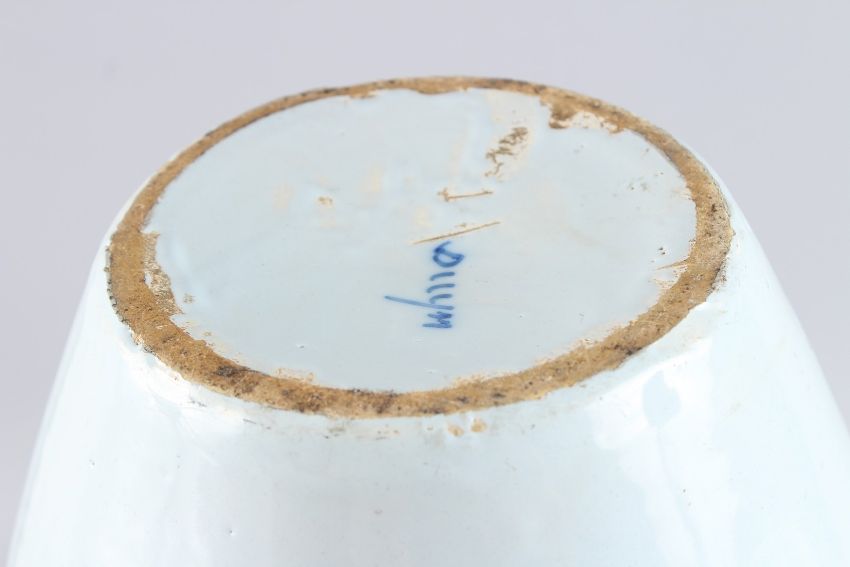 A DUTCH BLUE AND WHITE TIN GLAZE JAR painted with peacocks and Named ROOSE REVIL.