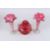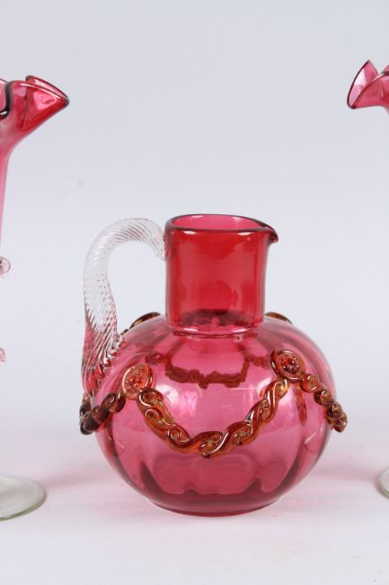 A PAIR OF VICTORIAN RUBY GLASS TAPERING FLOWER VASES, 10ins high, and a BULBOUS JUG, 6.5ins high (3).