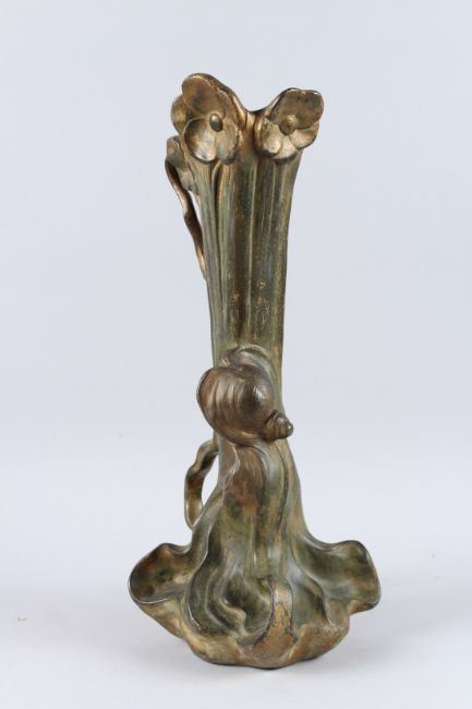 AN ART NOUVEAU BRONZE VASE EWER with scrolls, leaves and snails.