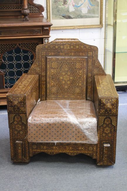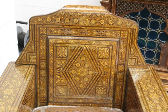 A SUPERB PAIR OF ISLAMIC INLAID ARMCHAIRS with micro mosaic inlay and padded drop-in seats.