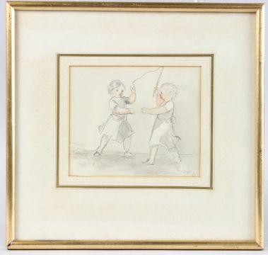 Two boys playing with a whip,