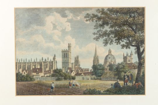 View of Cambridge University Colleges with farm workers and scholars