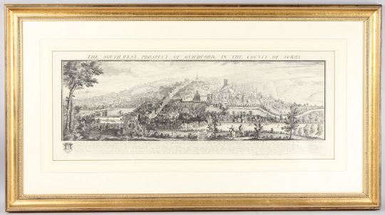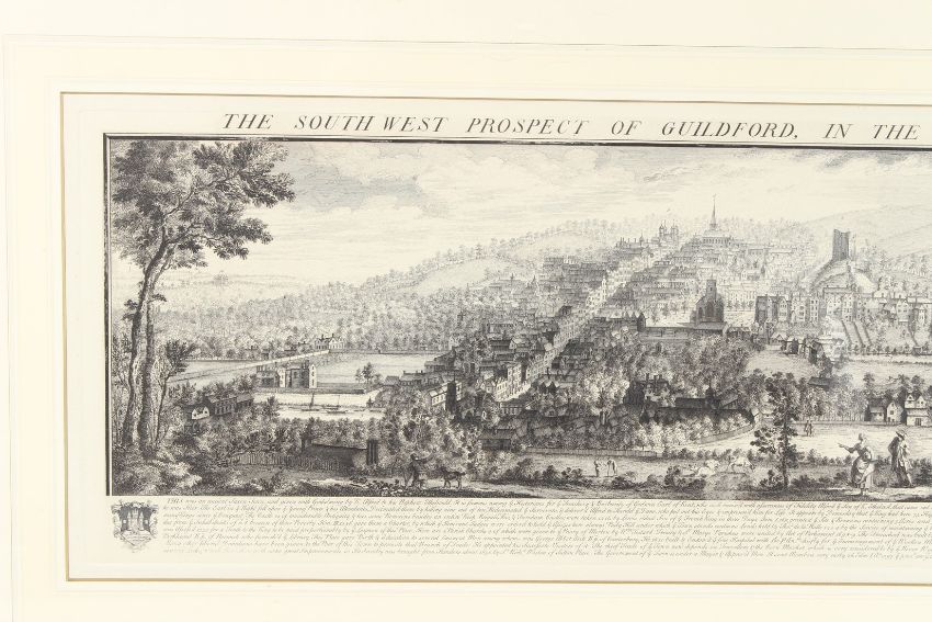 AFTER SAMUEL & NATHANIEL BUCK 'The South West Prospect of Guildford in the County of Surry' panoramic view with coat of arms and extensive annotation, engraving, first published 1738, 30cm x 82cm