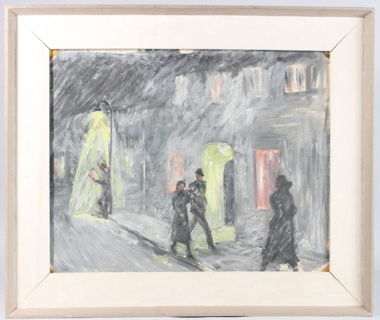 Figures walking along a street at night,