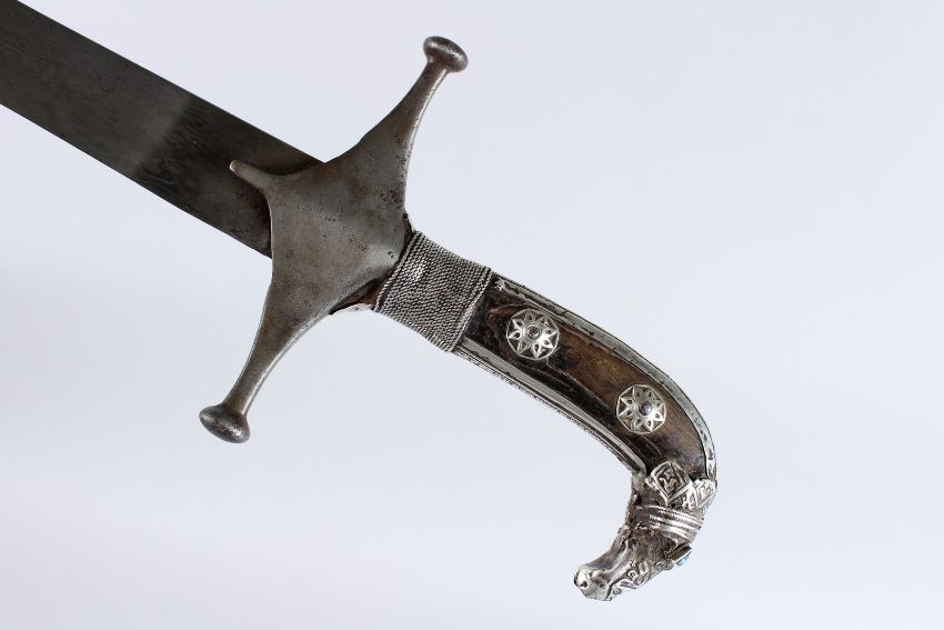 A 19TH CENTURY PERSIAN SHAMSHIR SWORD with silver mounted handle and very fine watered steel blade.
