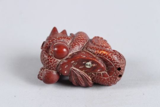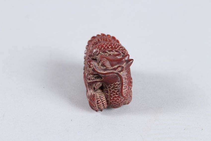 A CARVED HARDWOOD DRAGON NETSUKE.