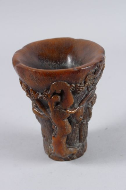 A CHINESE CARVED HORN LIBATION CUP, the sides carved with figures and almond blossom.