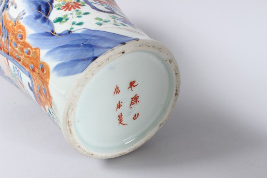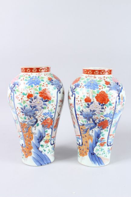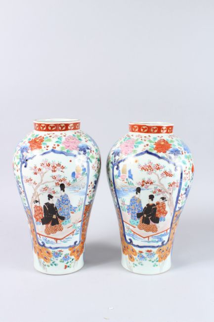A PAIR OF JAPANESE IMARI VASES, painted with figures and flowers on two panels.