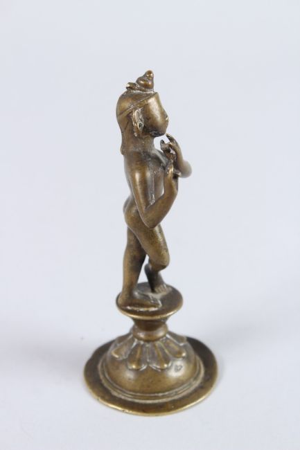AN INDIAN BRONZE FIGURE OF THE HINDU GOD KRISHNA in his youthful form, on a circular base.