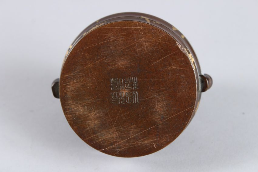 A CHINESE BRONZE GOLD SPLASH CIRCULAR CENSER with swing handle.