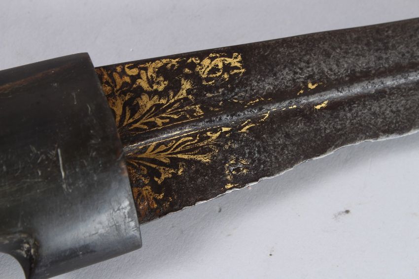 A LARGE 18TH CENTURY OTTOMAN TURKISH DAGGER with gold inlaid watered steel blade and horn handle.
