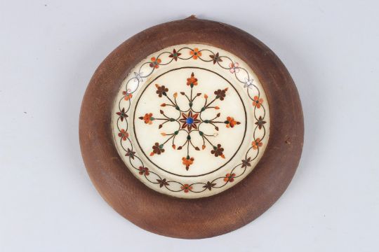 A FINE 19TH CENTURY INDIAN AGRA PIETRA DURA INLAID MARBLE DISH within a fabric covered frame.