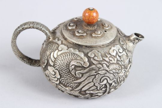 A CHINESE WHITE METAL CARVED DRAGON TEAPOT.