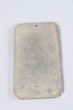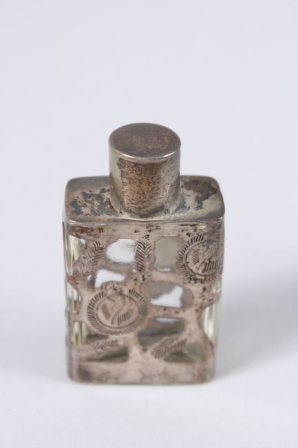 A CHINESE SILVER TABLET with figures and calligraphy, 4ins x 2.5ins, and a small scent bottle, 2.5ins high (2).