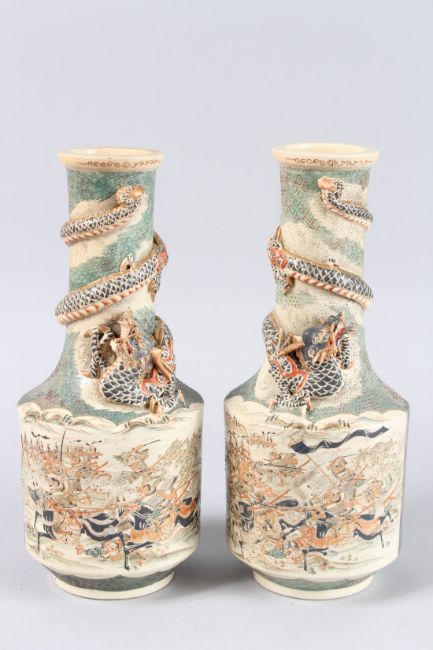 A PAIR OF JAPANESE SATSUMA DRAGON VASES with two large panels of figures and dragons around the necks.