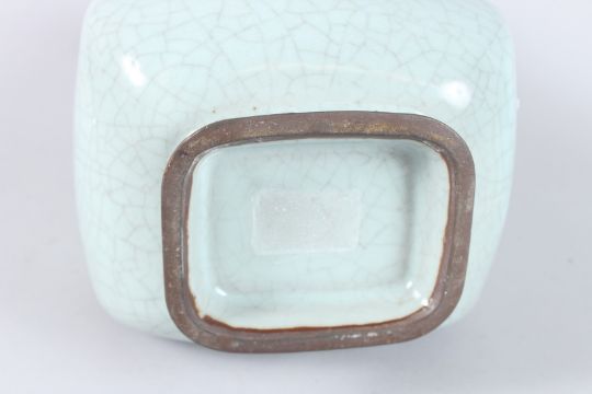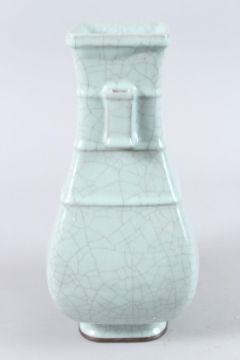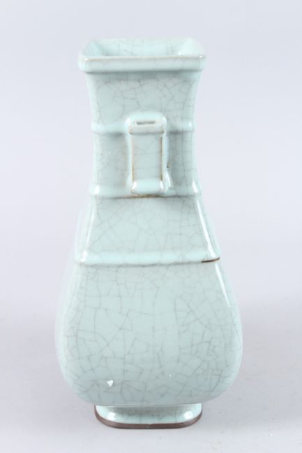A CHINESE CELADON CRACKLE GLAZE TWIN HANDLED PORCELAIN VASE, of square baluster form.