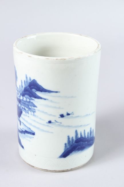 A CHINESE BLUE AND WHITE CIRCULAR BRUSH POT with landscape design.