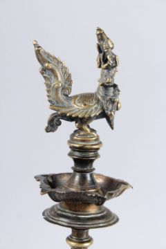 AN 18TH CENTURY BRASS OIL LAMP with a bird god, on a circular base.