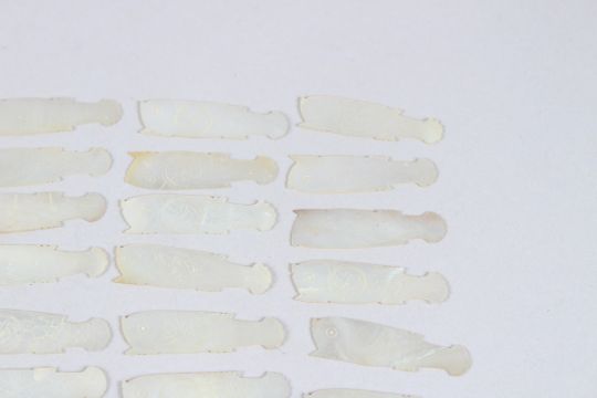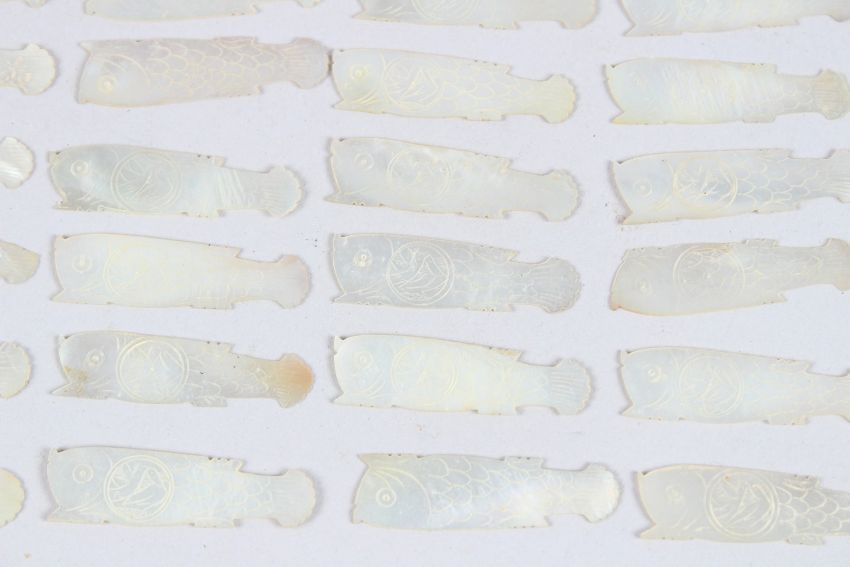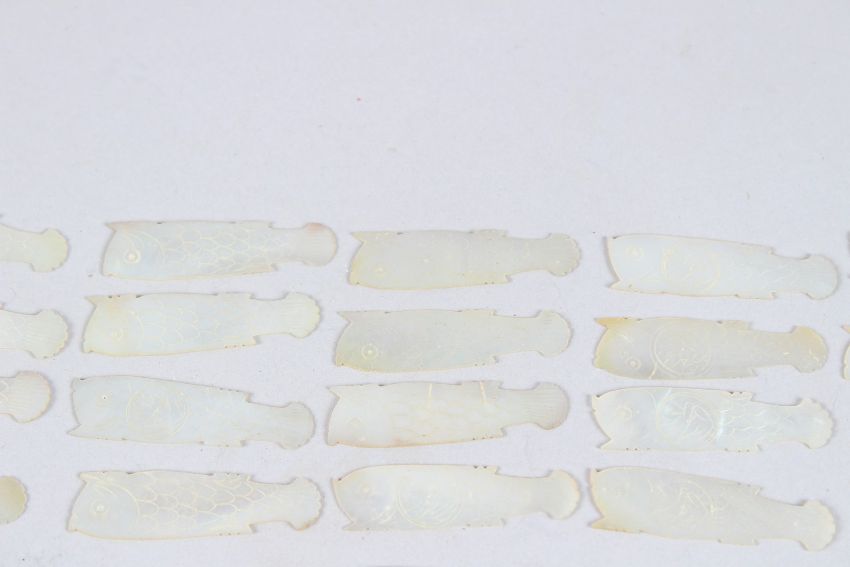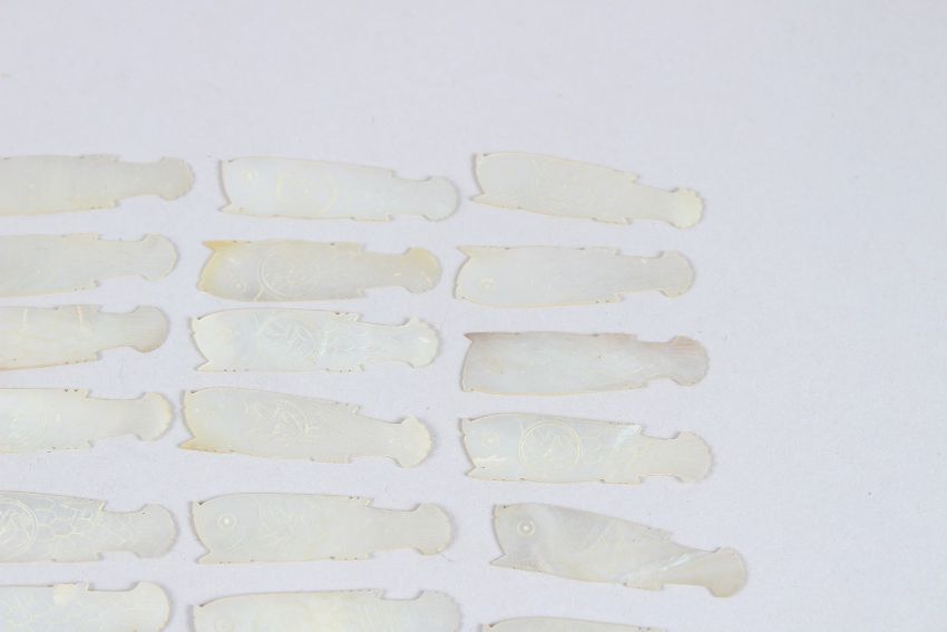 A LARGE COLLECTION OF FINELY ENGRAVED 19TH CENTURY CHINESE CANTONESE MOTHER-OF-PEARL FISH SHAPED COUNTERS (around 70 pieces).