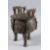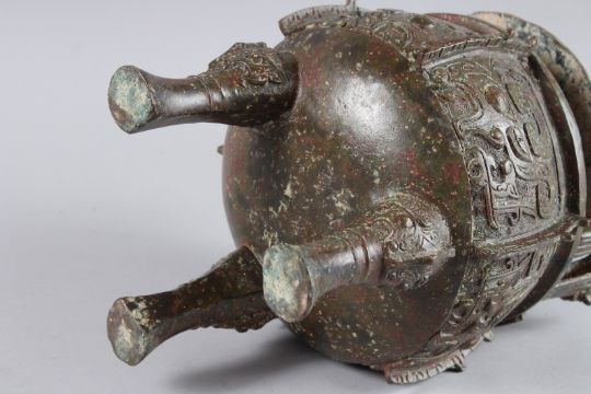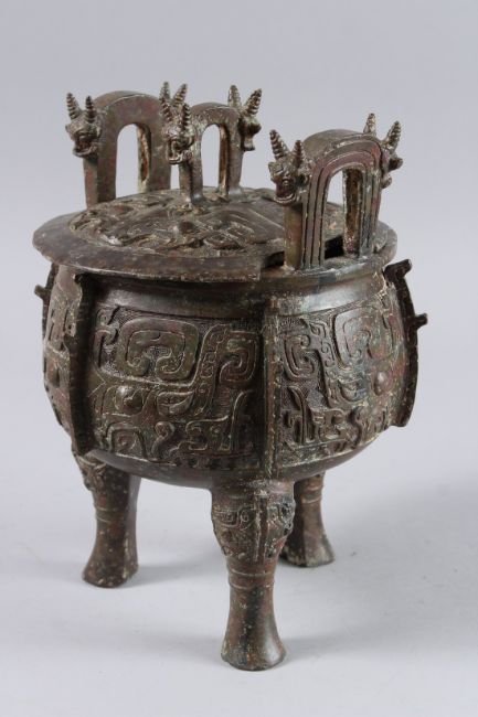 A GOOD ARCHAIC CIRCULAR BRONZE, TWO HANDLE VESSEL AND LID with medallions, on three feet.