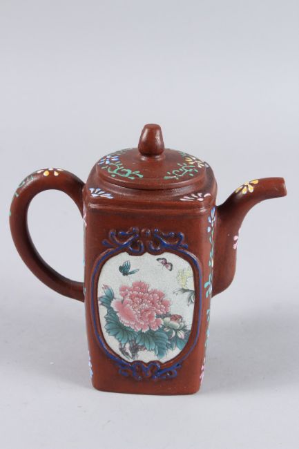 A YIXING TEAPOT AND COVER with panels of flowers.