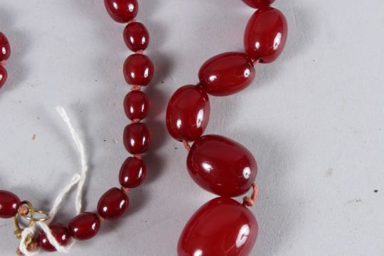 TWO CHERRY AMBER TYPE BEAD NECKLACES.