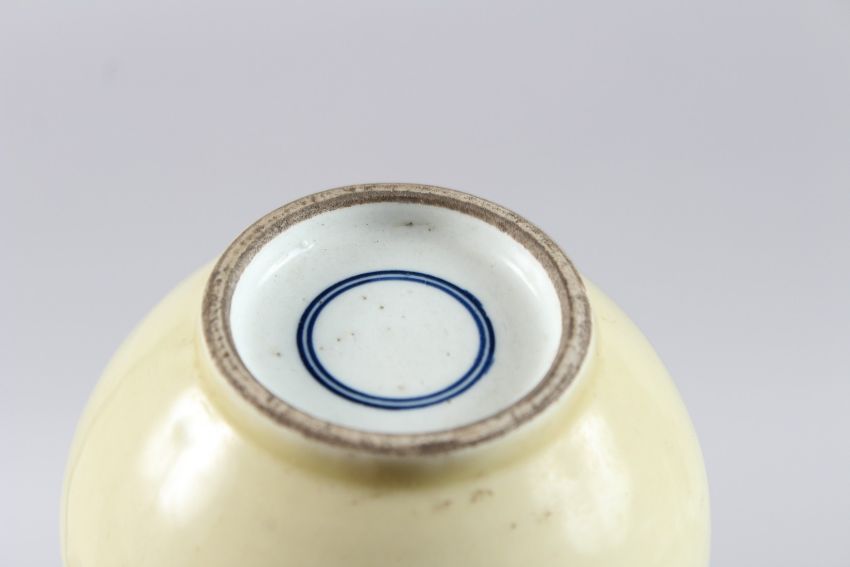 A CHINESE CREAM, BLUE AND WHITE BULBOUS VASE.