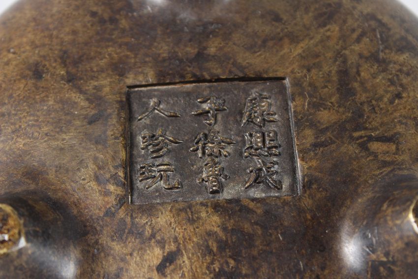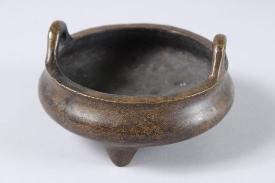 A CHINESE TWO HANDLED BRONZE CENSER, six impressed marks.