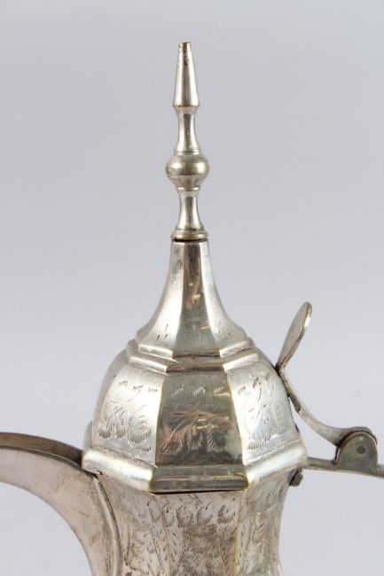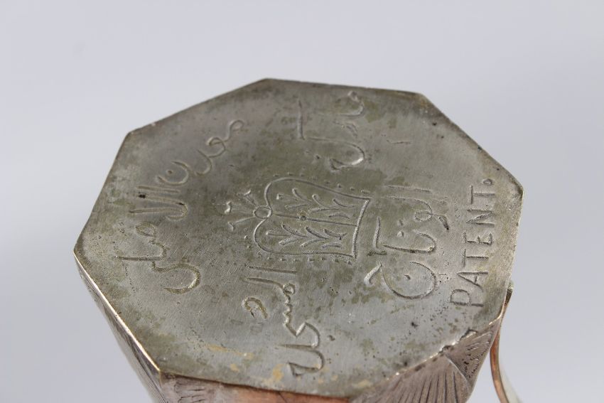 A HEAVY WHITE METAL OCTAGONAL COFFEE POT.