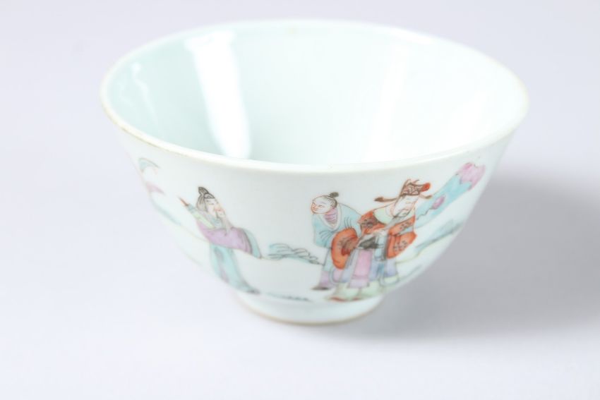 A CHINESE FAMILLE ROSE CIRCULAR BOWL, 4ins diameter, and a cock fighting plate, 7ins diameter (2).