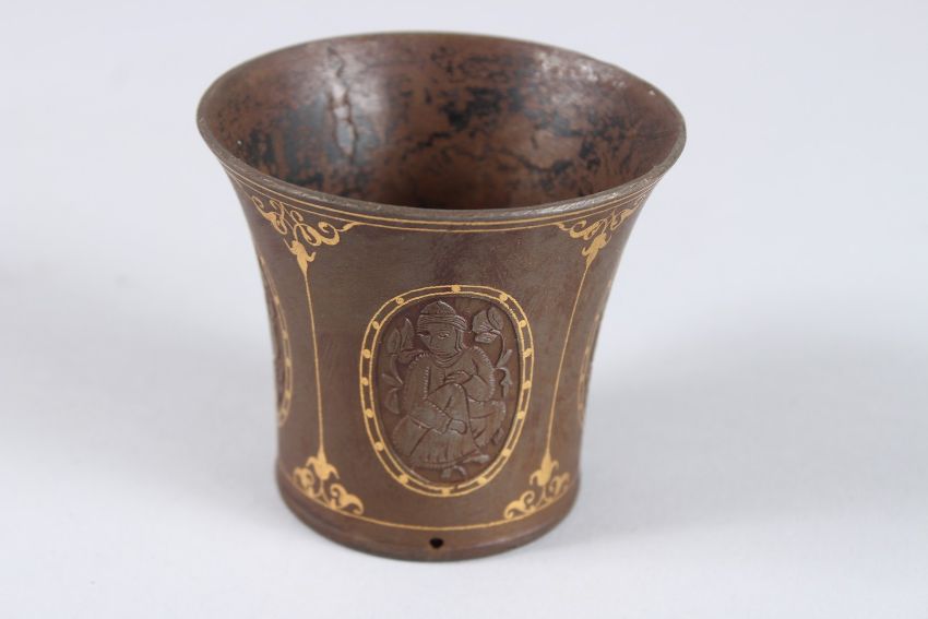 A PERSIAN METAL GOLD INLAID HOOKAH BASE with oval panels of figures and flowers.