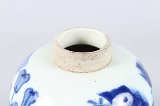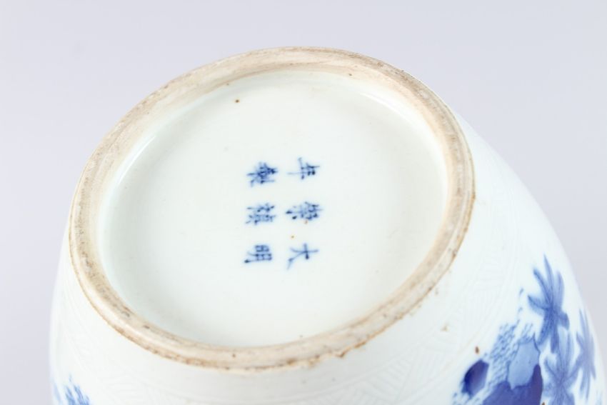 A CHINESE BLUE AND WHITE PORCELAIN JAR, early 20th Century, painted with figures in a landscape.